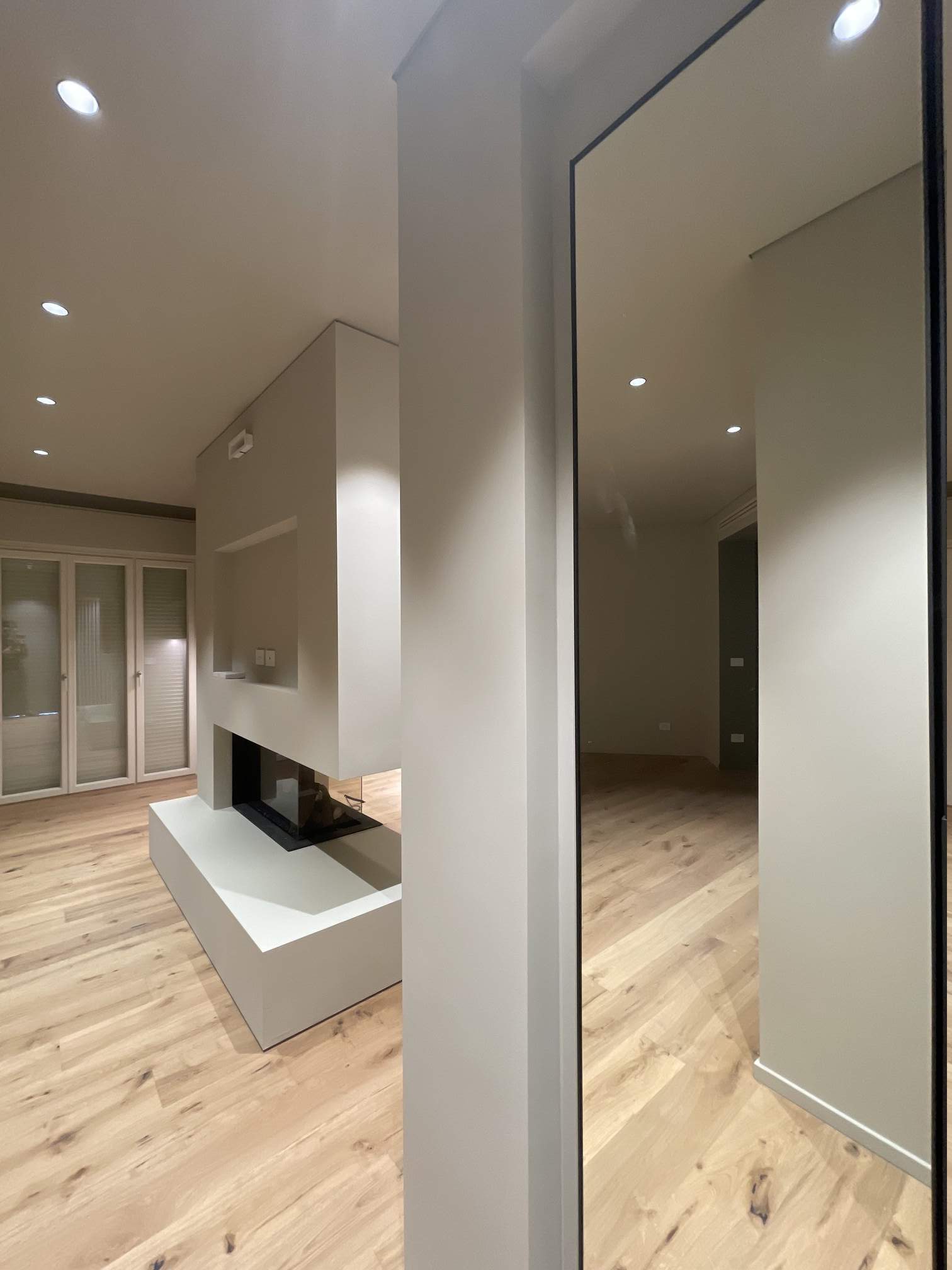 La riconfigurazione planimetrica ha dato vita a una sequenza di ambienti fluidi, con un camino centrale a doppia faccia come fulcro visivo e funzionale del nuovo living. Una zona di passaggio, pensata come spazio contemplativo e immerso nel verde, connette il living alla zona cucina/pranzo. Materiali caldi come il parquet naturale dialogano con pareti e arredi su misura dalle tonalità neutre. L’illuminazione integrata valorizza i volumi, mentre l’uso di porte a filo e nicchie contenitive contribuisce a un’estetica essenziale ma accogliente. Ogni ambiente è calibrato su un gesto lento, domestico, pensato per accompagnare il tempo che passa.